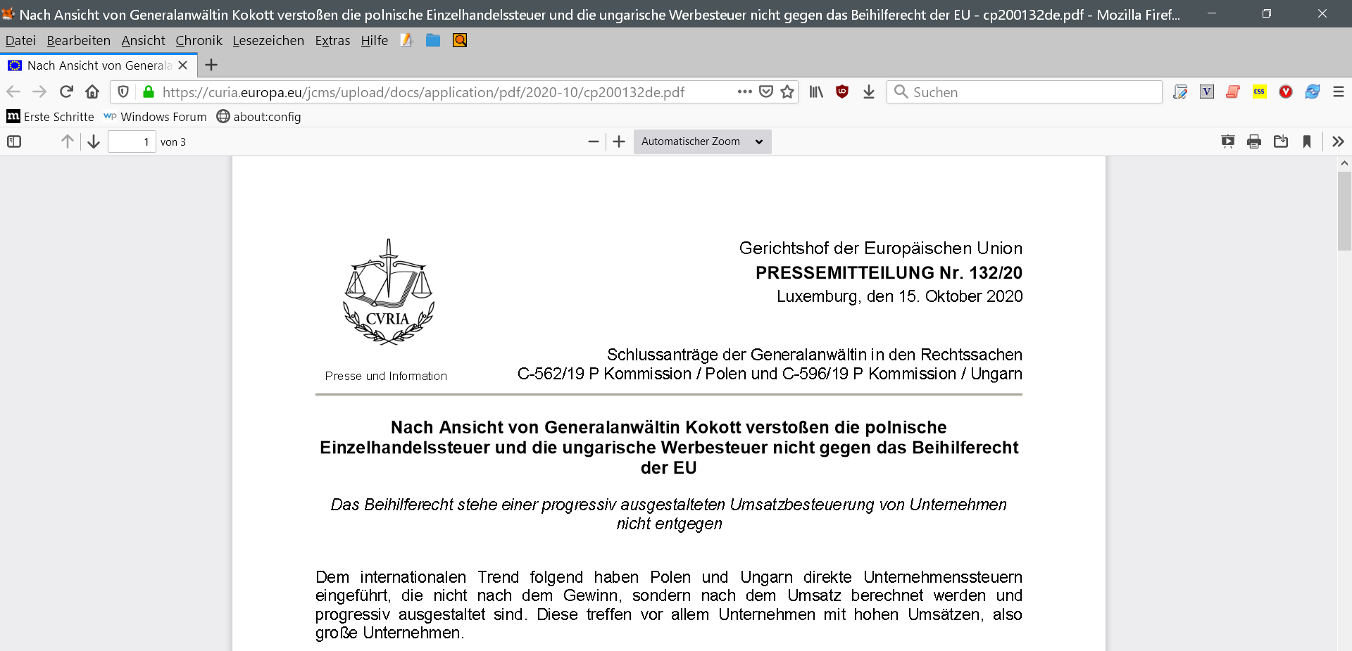 Auch mit dem aktuellen Firefox 82.0, der heute per Systemupdate eingespielt wurde, ändert sich nix an der verkorksten Darstellung der PDF; hab' dafür extra eine andere Pressemitteilung des EuGH aufgerufen.