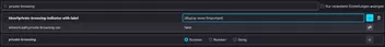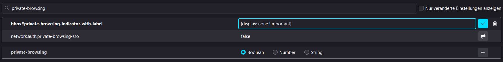 Und genau das habe ich gemacht. Nachdem ich Firefox mit about:config so eingestellt hatte, dass die CSS-Datei verwendet werden darf, wurde offensichtlich der Parameter "hbox#private-browsing-indicator-with-label" erzeugt mit dem Wert "{display: none !important}" versehen, der aus der CSS-Datei ausgelesen wurde, denn dort steht er ja. Und diese Datei habe ich mit Copy & Paste nach der Anweisung in diesem Thread erzeugt, wie gewünscht. In der Config habe ich nur nachgeschaut, was sich da geändert hat. Manuell eingetragen habe ich genau nichts.