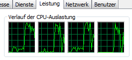 Hier die CPU-Auslastung bei Aufruf/Laden/Aufbau der Seite "4players.de" im FF 55 und 4 Threads a 800 Mhz. Wie ihr sehen könnt geht die Auslastung locker an die bis zu 100%...