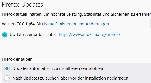 Ich war, wie schon angekündigt, im Januar ein paar Wochen verreist. Danach war ich einige Zeit außer Gefecht und ls ich wieder etwas intensiver am PC arbeiten konnte, habe ich zunächst gar nicht bemerkt, dass sich das Problem von selbst gelöst hatte. Die Updates hatten/haben sich, zuletzt gestern V76, wunschgemäß automatisch installiert. Insoweit bin ich ganz froh, keine größeren Aktionen gestartet zu haben, auch wenn ich natürlich gerne gewusst hätte, woran es gelegen hat.