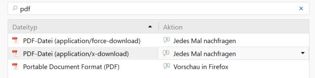 Da kann ich zwischen »Jedes mal nachfragen», »Datei speichern« und »andere Anwendung« auswählen. Ich hätte jetzt unter »andere Anwendung« erwartet den Fuchs auswählen zu können.
