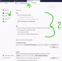 In den Einstellungen von FF komme ich nicht über die erste Seite "Allgemein" hinaus. In der Adresszeile wird about:config#home angezeigt. Das "home" ändert sich jeweils in search, privacy, sync, wenn ich auf den jeweiligen Bereich links anklicke.