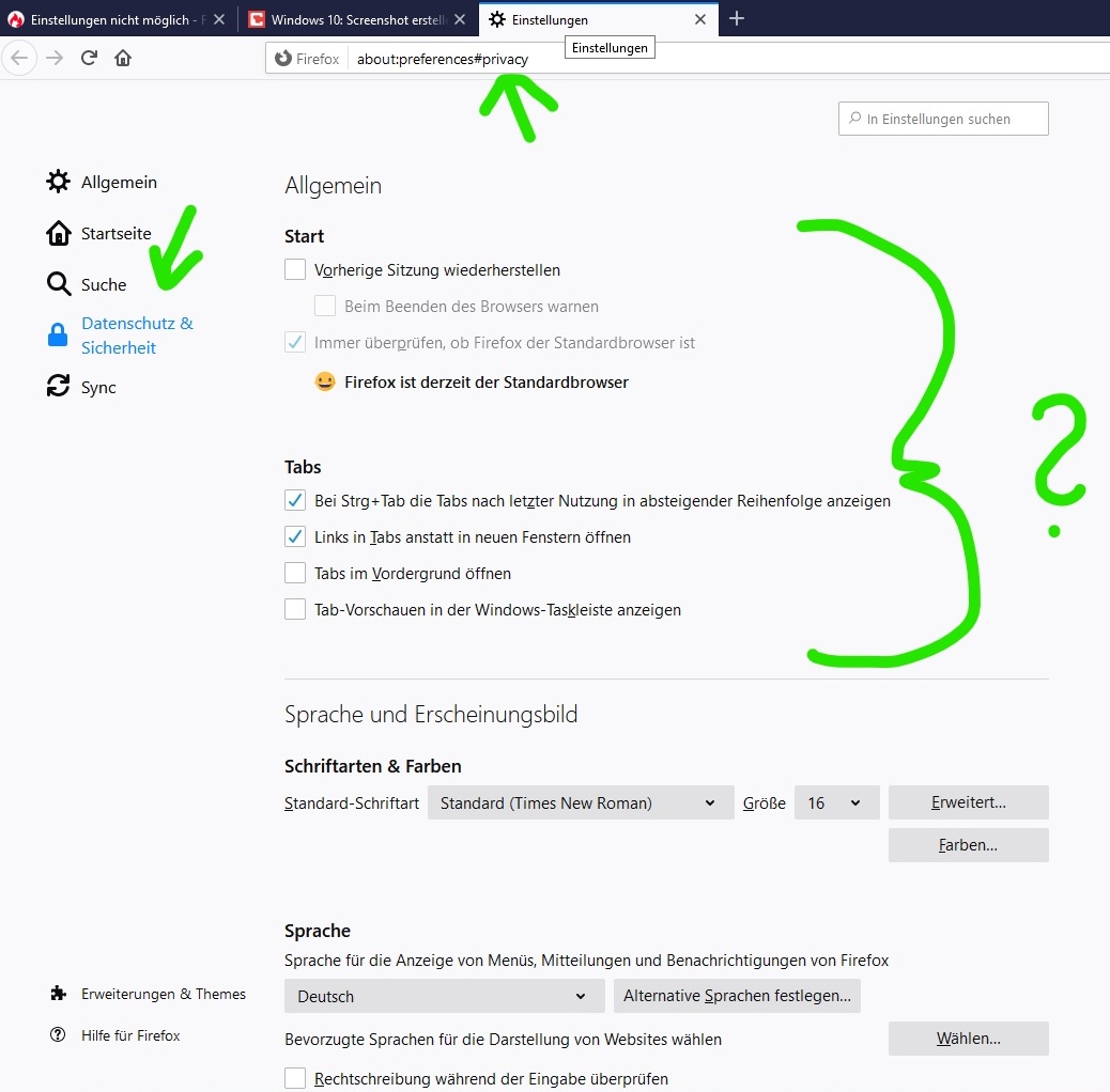 Sieht dann so z.B. aus! Obwohl Datensch. & Sicherh. angeklickt und in Adresszeile...#privacy steht, sieht man die Menüpunkte von "Allgemein".