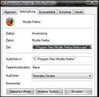 Habe nun eine komplett neue Verknüpfung auf dem Desktop zum FF angelegt, die entsprechenden Parameter geändert bzw um -P vervollständigt. Wenn ich diese Verknüpfung anklicke öffnet sich "nicht" der Prof.-Manager sondern ein ganz gewöhnliches FF Fenster ! Anbei ein Screen der neuen Verküpfung/Eigenschaften.