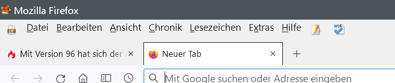 habe gerade auf Version 96 upgedatet, dabei fiel mir sofort auf das sich die Tabs optisch verändert haben. So ist jetzt ein schwarzer Rahmen um den Tab, und der Tab ist nicht mit der Toolbar verbunden.