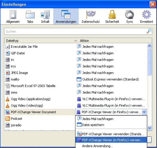 Extras > Einstellungen > Anwendungen > PDF = -