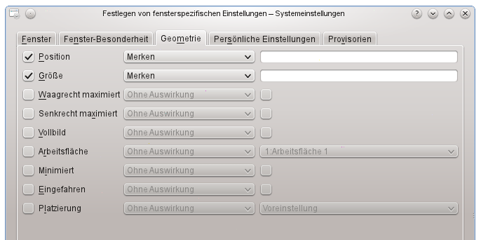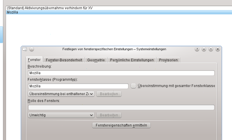 Ich vermute, dass es an KDE liegt, daher hier zwei Screenshots mit den Einstellungen im Fensterverhalten Modul der KDE-Systemeinstellungen: