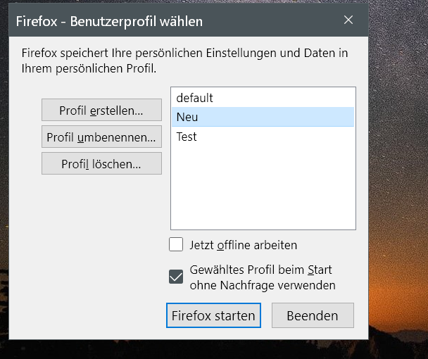 Ausserdem ist about:profiles nur ein Bookmark entfernt, Start des weiteren FF insgsamt mit 2 Klicks