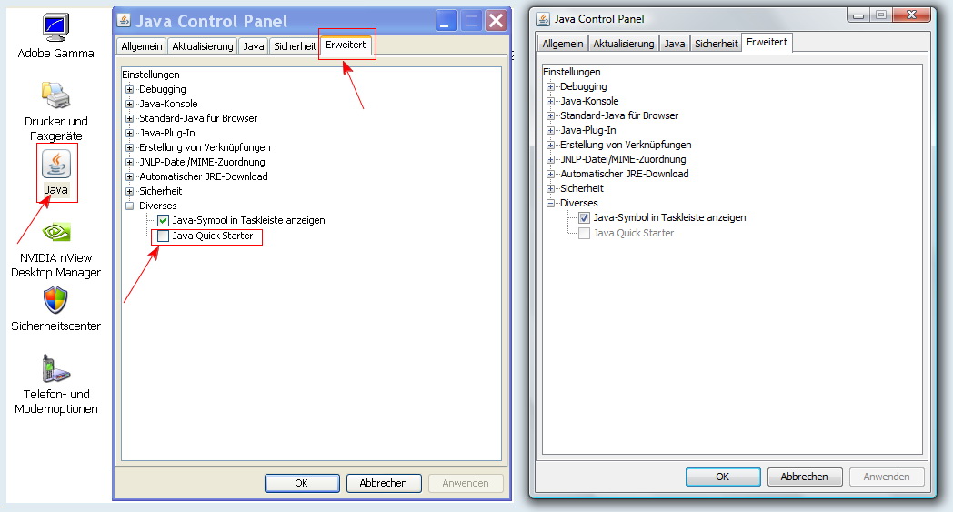 Dazu klick auf Start - Einstellungen - Systemsteuerung - Java