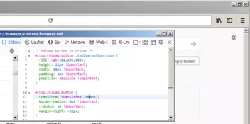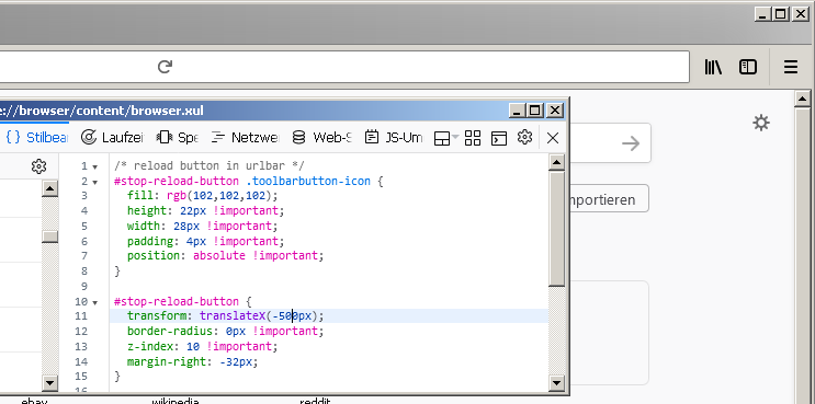 Alles anzeigen/* reload button in urlbar */ #stop-button, #reload-button { padding: 2px !important; } #stop-reload-button .toolbarbutton-icon, #stop-button .toolbarbutton-icon, #reload-button .toolbarbutton-icon { fill: rgb(102,102,102); height: 14px !important; width: 18px !important; padding: 0px !important; } #stop-reload-button { transform: translateX(-29px); border-radius: 0px !important; margin-right: -26px; margin-top: 8px !important; margin-bottom: 8px !important; width: 18px !important; }