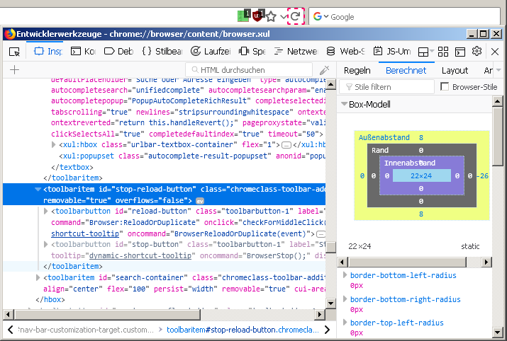 Die einzige CSS Anweisung die Auswirkung auf #stop-reload-button hat ist max-height, aber die schrumpf dann leider die ganze nav-bar zusammen.