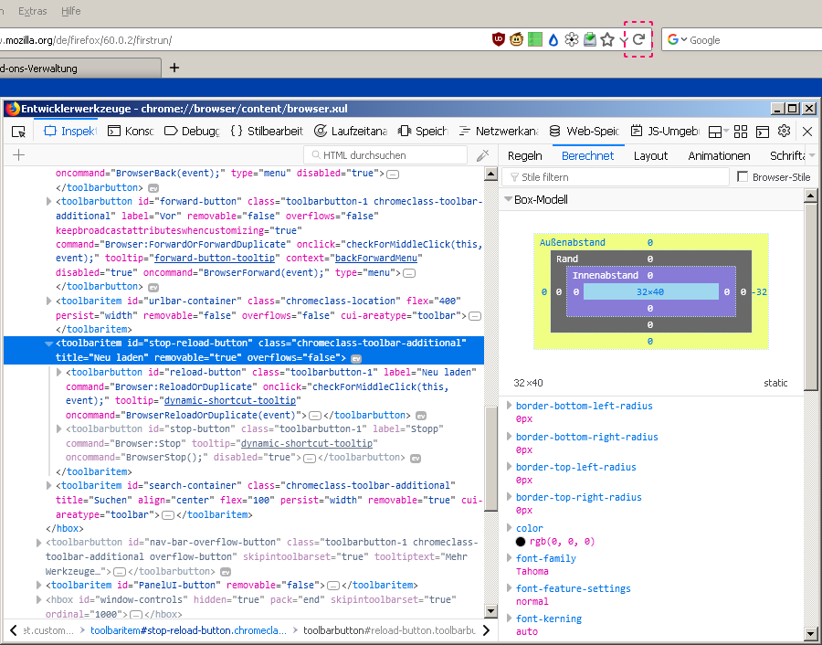 Der Reloadbutton von der Extension ist von der größe her für mich passend, aber ich schaffe es nicht die gewünschte Reihenfolge hinbekommen.