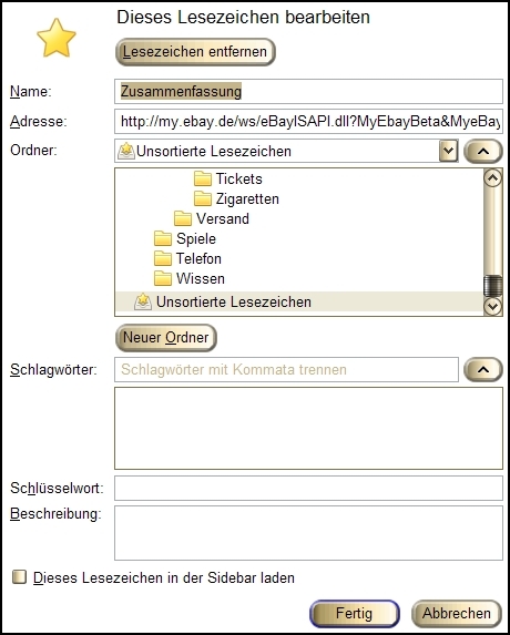 @ gammaburst: Danke für den Tip, er funktioniert aber leider nicht ganz: Tatsächlich erscheint das Dialogfeld im letzten benutzen Ordner, aber dann steht da geschrieben "Dieses Lesezeichen bearbeiten - Dieses Lesezeichen löschen", und das letzte in dem Ordner gespeicherte Lesezeichen wird überschrieben!