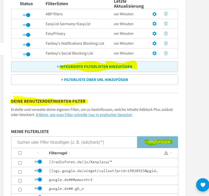 ...Was meinst du mit selbst erstellten und integrierten Listen? Seiten die man manuell vom adblocker ausgenommen hat?