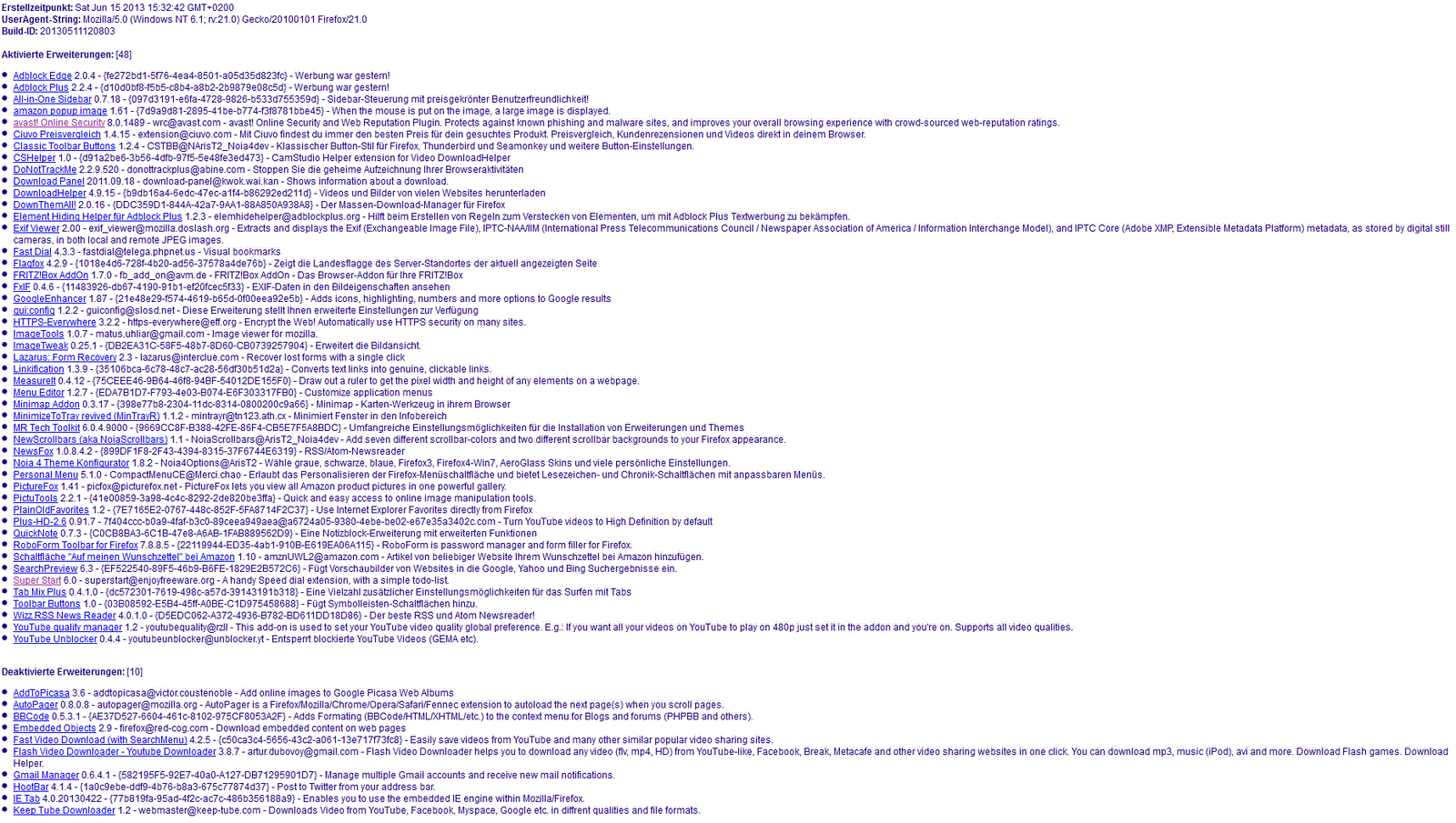 jetzt sehe ich ganz klar (insofern,daß ich alles deaktivierte) Also liegt es am Programm. Werde es mal neu drüberinstallieren,vielleicht ... Nur ist es seltsam,daß ein Start mit deaktivierten Addons nur einmal normal gestartet wird. Man darf wirklich nicht alles glauben hähähä. Also Einstellungen, aber, da ist alles plausibel aktiviert