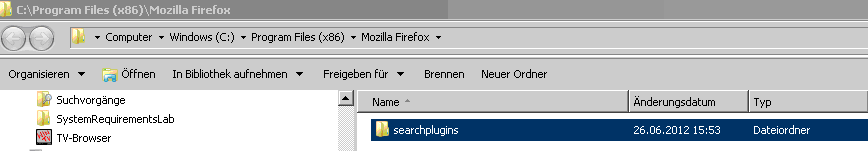 ich finde unter Program Files(x86) den Ordner MOZILLA FIREFOX in diesem ist aber nur das File "searchplugin" enthalten.