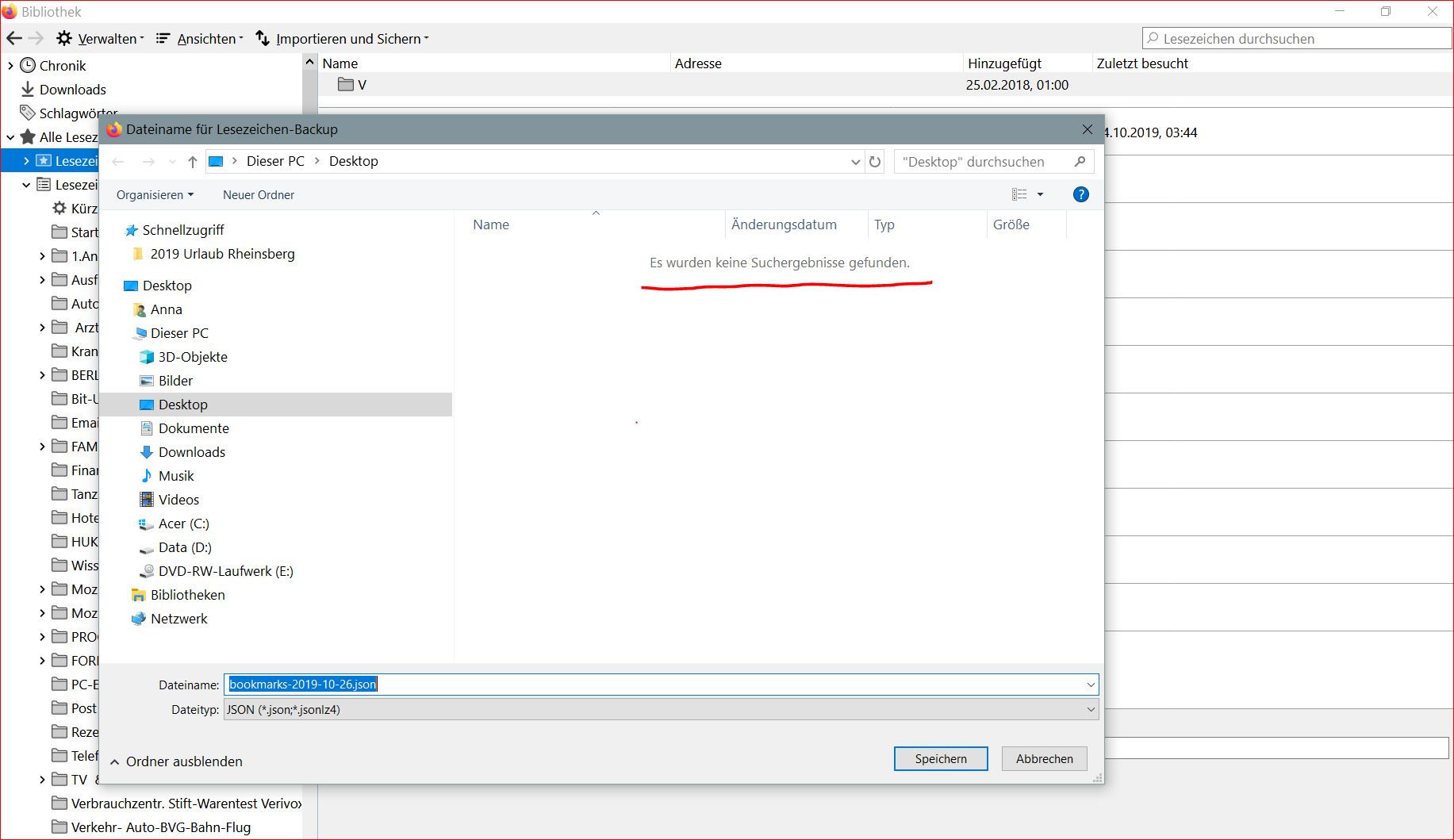 Neuerdings lassen sich meine Lesezeichen, die vorhanden sind und die ich benutzen kann, auch unter "Lesezeichen verwalten", nicht mehr sichern.