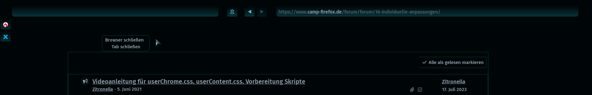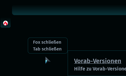 Weiterhin habe ich die Titelleiste ausgeblendet. Dadurch werden aber die drei hauseigenen Aktionsknöpfe des Browsers nicht mehr angezeigt. Ich habe bis dato ein Addon als Icon zum Schließen verwendet, als Lösung hat mir das aber nicht so recht zugesagt, da ich schon ein JS für "Tab schließen" im Kontextmenü habe. Da war es naheliegend, sowas auch zum Schließen des Browsers zu haben. Nun ist alles so wie gewünscht, sehr schön.