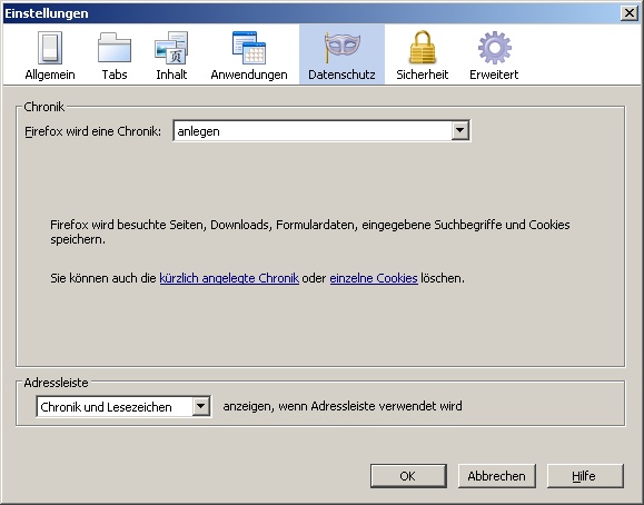 Also, ich habe Cookies erlauben deaktiviert -> dann bisschen gesurft -> dann wieder erlaubt -> und nun wenn ich auf Datenschutz gehen, kommt nur noch die Chronik-Einstellungen (siehe Dateianhang). Firefox schon mehrmals neu gestartet, bleibt mir was anderes übrig als neu zu installieren? Wisst ihr was das für ein Problem ist, ist das bekannt oder iwie anders?!