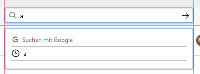 Alles anzeigen#search-container { min-width: 250px !important; max-width: 380px !important; } #PopupSearchAutoComplete { margin-left: calc(0px - var(--panel-shadow-margin)) !important; background: transparent !important; --panel-shadow-margin: 4px !important; --panel-shadow: 2px 2px 2px #787878 !important; --panel-border-color: transparent !important; --panel-border-radius: 4px !important; border-radius: 4px !important; outline: 2px solid #7FB0EF !important; outline-offset: calc(0px - var(--panel-shadow-margin) - 2px) !important; }Da bevorzuge ich den ersten CSS-Code, auch weil alle Ecken beim PopUp gerundet sind und nicht nur die unten rechts.