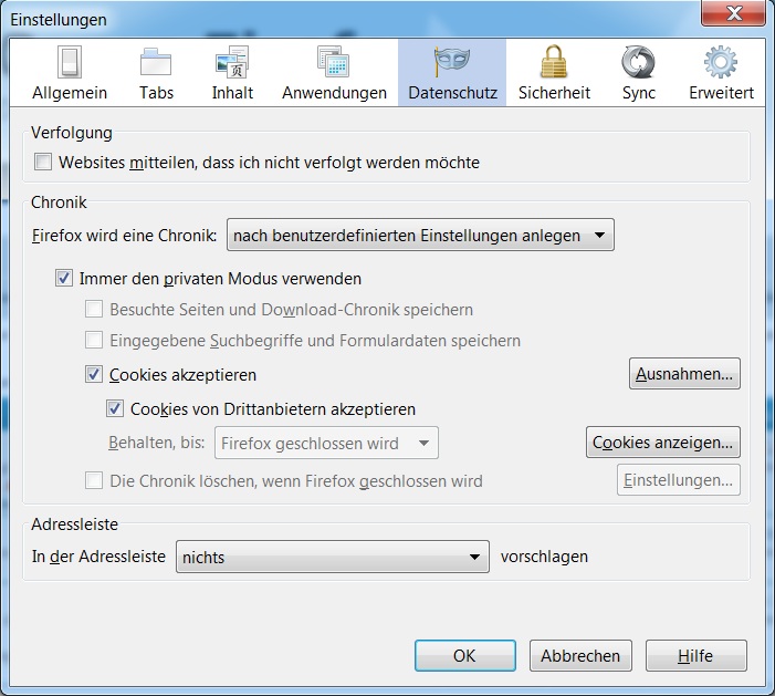 Ich habe nun einen neuen PC, keine Software vorinstalliert. System also neu aufgesetzt, alle Treiber installiert, AV-Software (ESET Smart Security), dann FF Erstinstallation und erstmal nur AdBlock dazu! Nun wollte ich meine Einstellungen wie gewohnt vornehmen, aber leider sind einige Optionen ausgegraut, also nicht aktivierbar. Ich hab das hier schon mal gelesen, aber ich finde den Thread nicht, weil mir die Suche alles Möglche vorschlägt. Habe mal 2 Bilder dazu! Das sieht im abgesicherten Modus genauso aus.