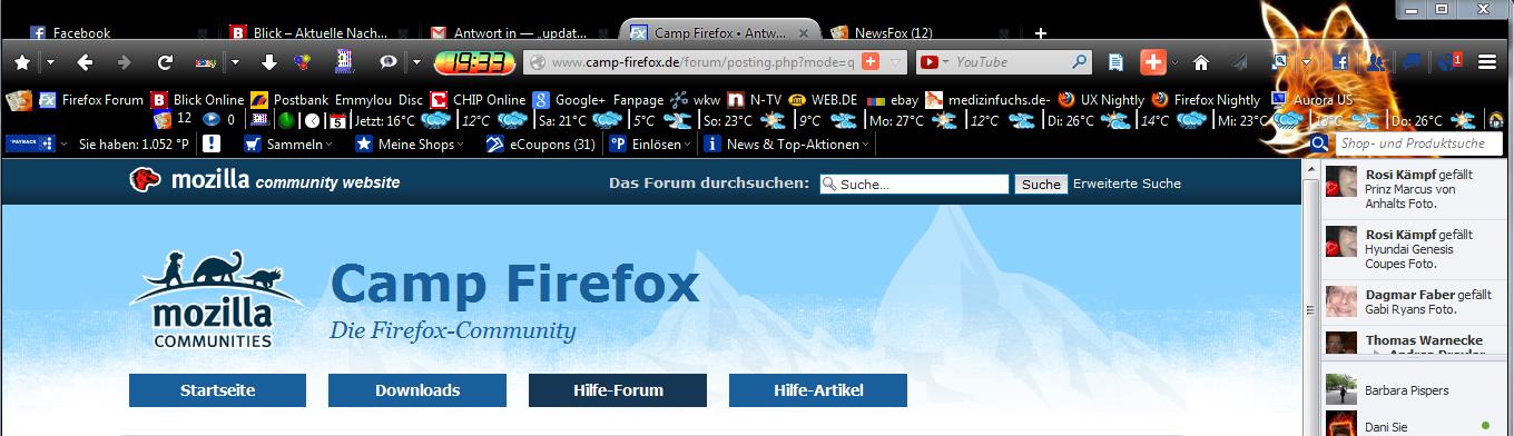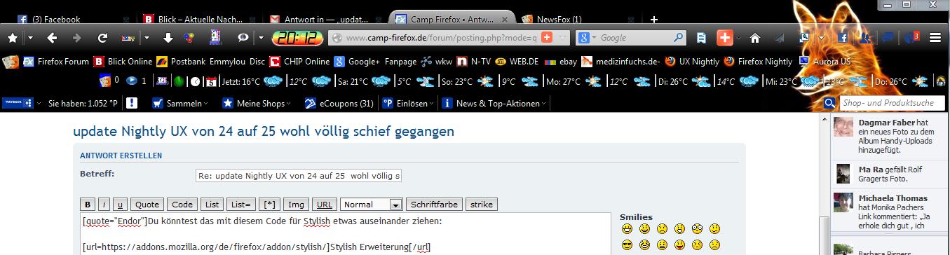 Nach dem heutigen update ( nightly UX) ist meine ganze symbolleiste mit meinem wetter und anderen buttons spurlos verschwunden und nur noch ein leerer Raum.wen sich da nichts ändert und es wirklich später, auch bei den fertigen Firefox bei diesem australis bleibt dann weiß ich nicht mehr weiter