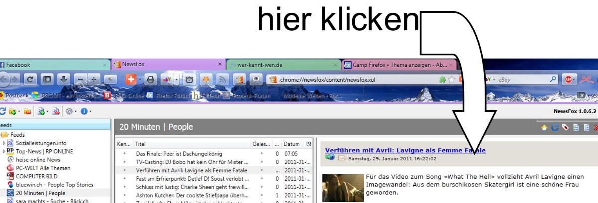 Verwende das Add on NewsFox für meine Feeds. Die Feeds werden auch einwandfrei geladen. Beim anklicken der ersten beiden Spalten läuft alles normal Beim klick(siehe Bild ) womit man den Bericht in einem neuen Tab öffnet wird Firefox 4beta11pre ( Minefeld) automatisch geschlossen. Dies geschieht bei meinem Rechner Win7 Premium sowie bei meinem Netbook Win 7 Starter wobei es bei dem Netbook immer passiert und bei dem Rechner seltener. Auf beiden Rechnern sind alle Einstellungen und Add ons gleich. Das Fenster mit dem Fehlerbericht habe ich auch jedesmal an Mozilla gesendet. So ich hoffe das war jetzt ein bischen besser