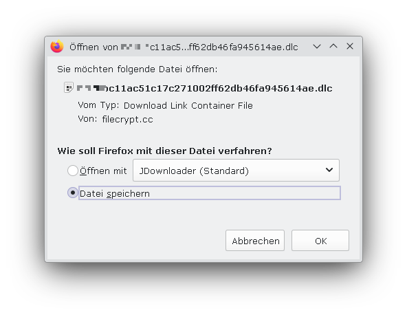 Dort ist "Datei speichern" vorausgewählt und ich muss dann umschalten auf "Öffnen mit ... JDownoader (Standard)" und dann auf Ok klicken. Dann funktioniert es.