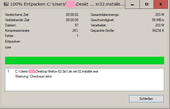 Wenn ich die Datei firefox-82.0a1.de.win32.installer.exe mit 7zip entpacke, bekomme ich diese Fehlermeldung