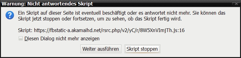 Nach wieder aktivierten JS und Laden von FB, hatte ich mal ein wenig gewartet. Es wurde die rechte Spalte zur Hälfte geladen (User News) und es erschien mehrfach folgendes Hinweisfenster, danach war wieder Schicht im Schacht.