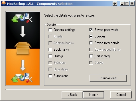 Nun habe ich noch ein mit MozBackup am 16-04-2016 erstelltes Backup (komplett). Dieses Backup kann man ja offensichtlich auch selektiv zurückspielen. Ich würde dann nur die Cookies auswählen und dann starten, z.B. so:[attachment=0]MozBackuo.jpg[/attachment]