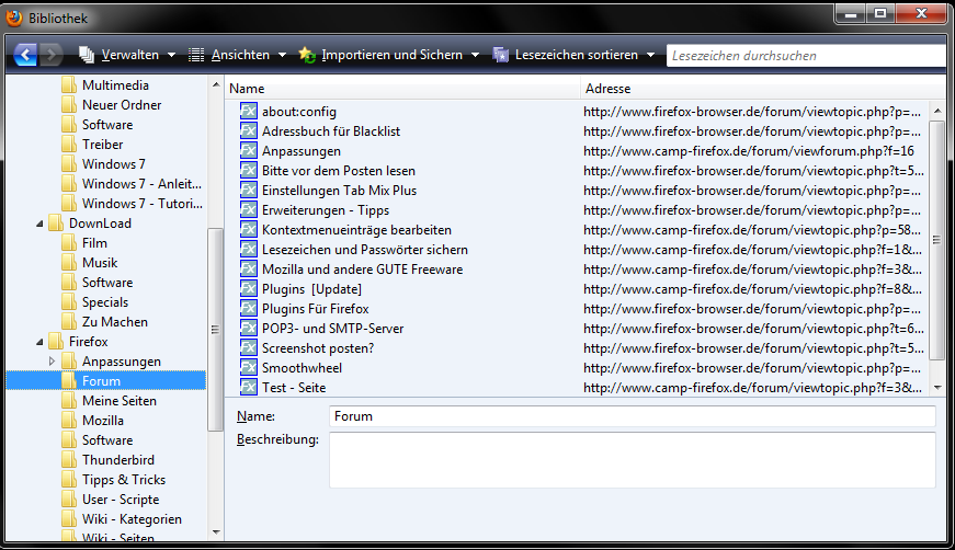 Lesezeichen > Lesezeichen verwalten