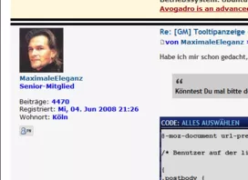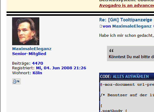 Alles anzeigen@namespace url(http://www.w3.org/1999/xhtml); @-moz-document url-prefix("http://www.t-online.de/"),url-prefix(http://www.winfuture-forum.de/){ body{ width: 1000px !important; margin-left: 400px !important; position: relative !important;} }