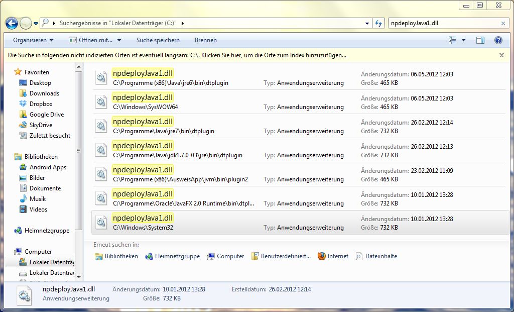 Die Datei "npdeployJava1.dll" gibt es bei mir 7-mal (siehe Anhang). Eine zweite AusweisApp Erweiterung hatte sich beim Update der Ausweisapp installiert. Ich hatte aber derzeit noch keinen Weg bzw. keine Zeit gehabt diese manuell zu löschen. Wie kann ich das am schnellsten machen?