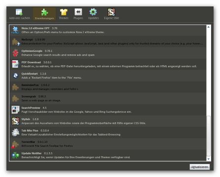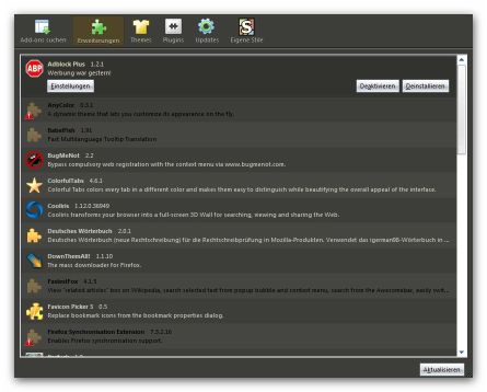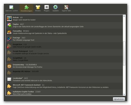 "Um den Erweiterungs- und Theme-Manager zu aktualisieren, schließen Sie den Browser (!!!) und löschen jeweils die extensions.rdf und die extensions.cache Datei im entsprechenden Profilordner. Bei erneutem Starten von Firefox werden die Dateien neu angelegt und der graue Eintrag ist weg bzw. werden die installierten Erweiterungen und Themes wieder angezeigt."