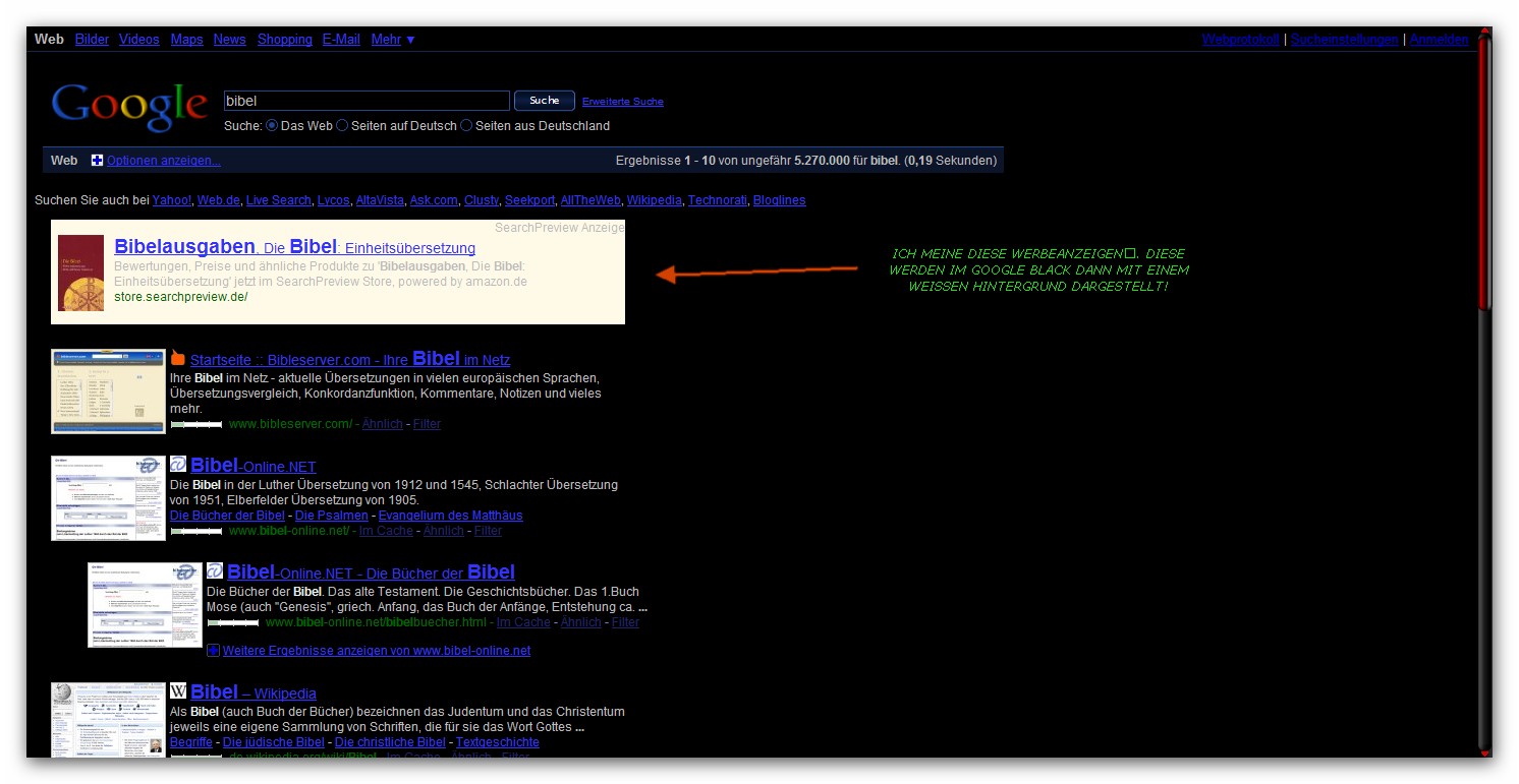 ,ich habe mein Google dark über stylisch eingerichtet. Also die Google site und die search site. Hat alles wunderbar funktioniert bis Google die Anzeigen (Web Bilder Videos Maps News Shopping E-Mail Mehr) zb. als "Einblendung" programmiert hat. Also ich meine die "nackte" Google-Anzeige bis man mit der Maus über die Google-Anzeigen "fährt" und die Einblendungen der Anzeigen erscheinen. Etwas kompliziert zu erklären. Ich hoffe ihr wisst trotzdem was ich meine! Diese Anzeigen erscheinen nun auf meinem Google-Dark als weiße Balken! :traurig: