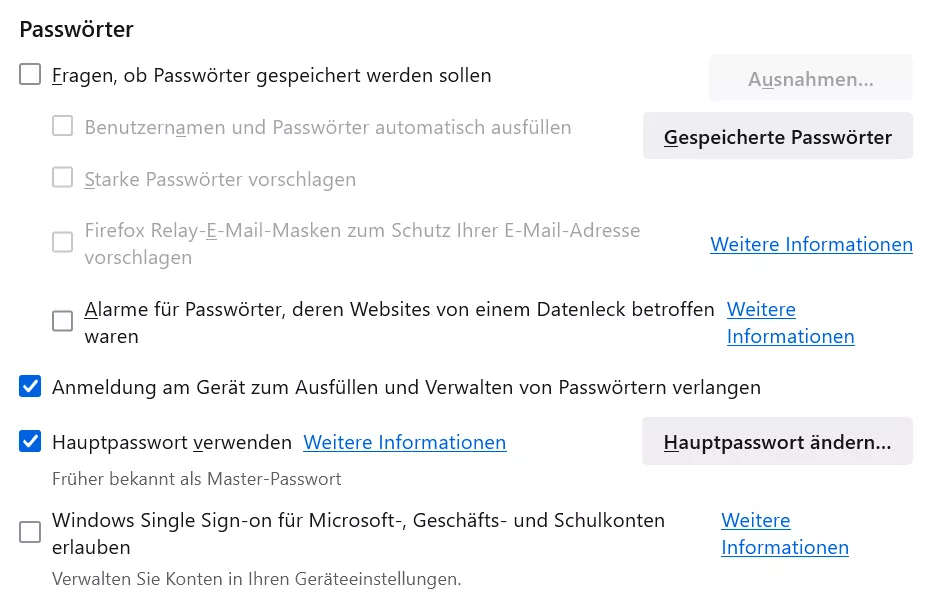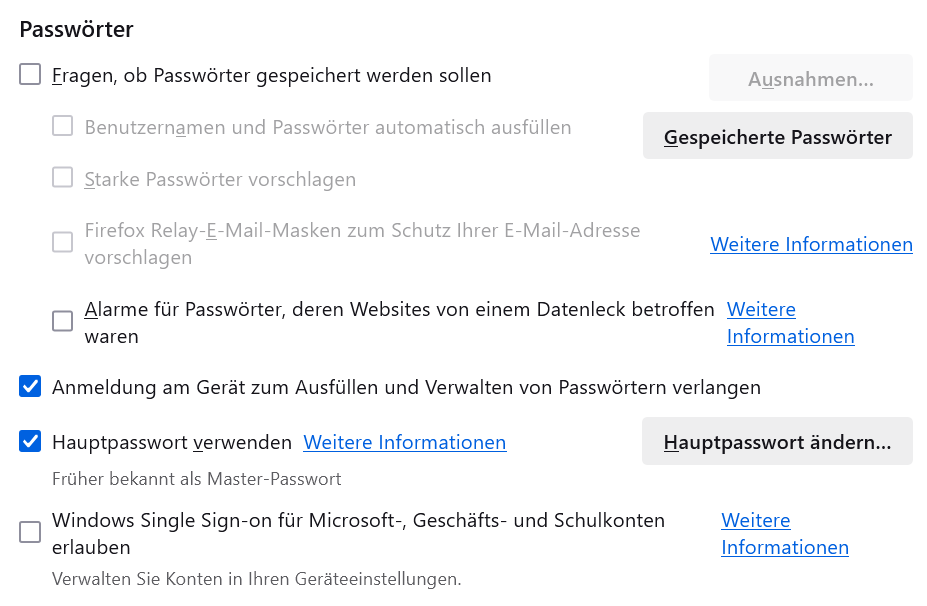 Wenn ich den Haken bei der Option raus nehme, dann muss ich ja Windowskennwort und Hauptpasswort eingeben. Und dann ist es erst mal deaktiviert. Aber wenn ich dann FF neu starte, dann fragt FF wieder nach dem Hauptpasswort und aktiviert die Funktion "Anmeldung am Gerät.." automatisch von selbst wieder.