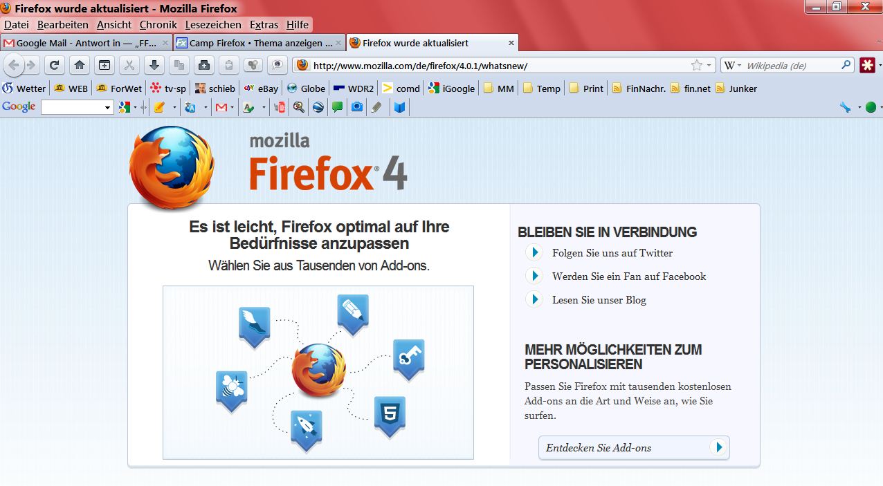 Firefox-Update ist automatisch erfolgt. Update über Add-ons Manager vom Google Mail Manager ohne Erfolg. Ebenso die manuelle Suche.