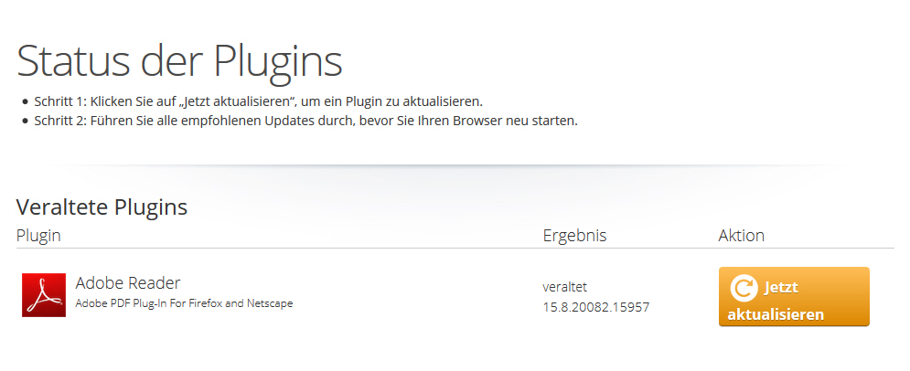erscheint unter Status, statt Adobe Acrobat Adobe Reader als veraltet,