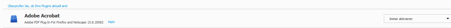 Auf meinem PC ist das Adobe Acrobat Plugin 15.8.20082.15957 installiert (es ist das aktuelle, gestern herunter geladen) und wird unter Plugins angezeigt.