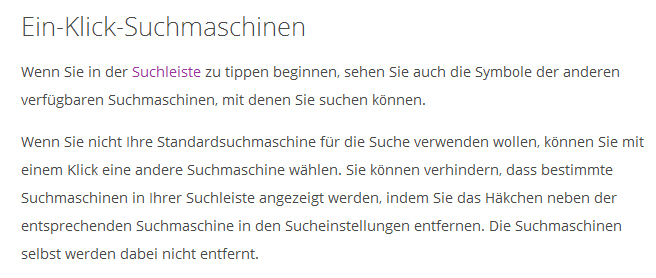 [attachment=0]suche 1.jpg[/attachment][attachment=1]suche 2.jpg[/attachment][attachment=2]suche 3.jpg[/attachment]"Wenn Sie in der Suchleiste zu tippen beginnen, sehen Sie auch die Symbole der anderen verfügbaren Suchmaschinen, mit denen Sie suchen können.