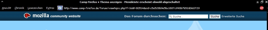 Doch nach einen Neustart von Firefox ist die Menüleiste wieder da obwohl noch immer unter "Ansicht" > "Symbolleiste" kein Häckchen bei "Menüleiste" gesetzt ist. Zum besseren verständnis der Situation habe in der Leiste noch "Addresse" und das Symbol von "Adblock plus".