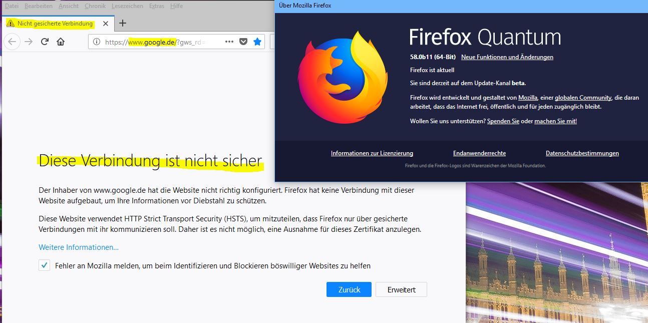 [attachment=0]Aufruf über Sicheren Browser Kaspersky.JPG[/attachment][attachment=1]Diese Verbindung ist nicht sicher.JPG[/attachment]Firefox Quantum - Version 58,0b11 (64-Bit) bringt bei vielen Webseiten, wie zB. Google, Youtube, Doodle, Kreissparkasse, die Meldung "Diese Verbindung ist nicht sicher". Betriebssystem Windows 10 Pro 64-Bit. Virenschutz: Kaspersky Internet Security.