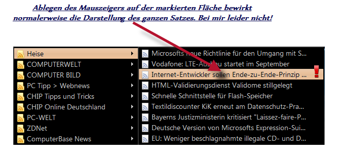 ich kann mich gut daran erinnern das ich beim daraufsetzen des Mauszeigers auf einen RSS Feed die komplette Überschrift bzw. den Titel lesen konnte. Dies funktioniert nun leider nicht mehr. Der Feedbalken ist nur einige Zentimeter breit und da fehlt dann halt ein Teil des Titels.