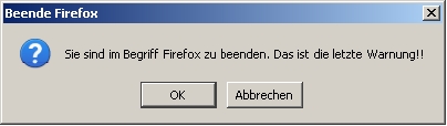 Wer einfach diese Rückfrage auch in Fx4 haben möchte, kann die Erweiterung Always Ask 2.0pre installieren. Die produziert die Warnung in dem nachfolgenden Bild nach Drücken des X rechts oben (aber letzten Endes ist das ja auch nur eine experimentelle Version, so dass man auch auf diesen Bug Fix https://bugzilla.mozilla.org/show_bug.cgi?id=629485 warten kann, um Datenverluste durch unerwartetes Schließen zu vermeiden.)