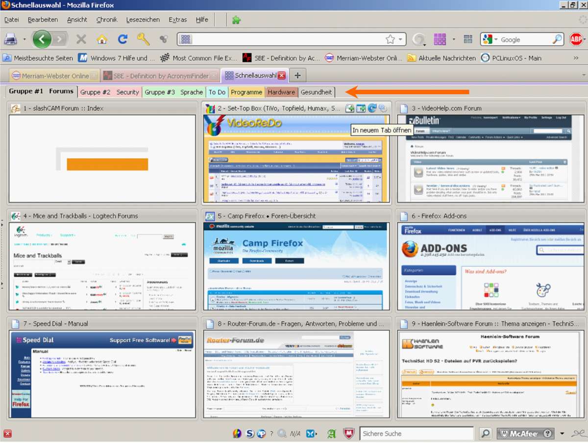 Ich habe ein Neunerfeld-Symbol für Speed Dial in der Symbolleiste. Wenn ich das anklicke, öffnet sich ein großes Neunerfeld mit 9 Thumbnails zum Anwählen. Diese Thumbnails haben Kontextmenüs mit einigen Bearbeitungspunkten. Diese Thumbnails habe ich aber nur für 1 Gruppe. Wenn ich weitere Gruppen eingerichtet habe, kann ich die nur über einen Listenfeld-Pfeil neben dem Neunerfeld-Symbol anwählen und erhalte dann Untermenüs, deren einzelne Menüpunkte kein Kontext-Menü mehr haben.