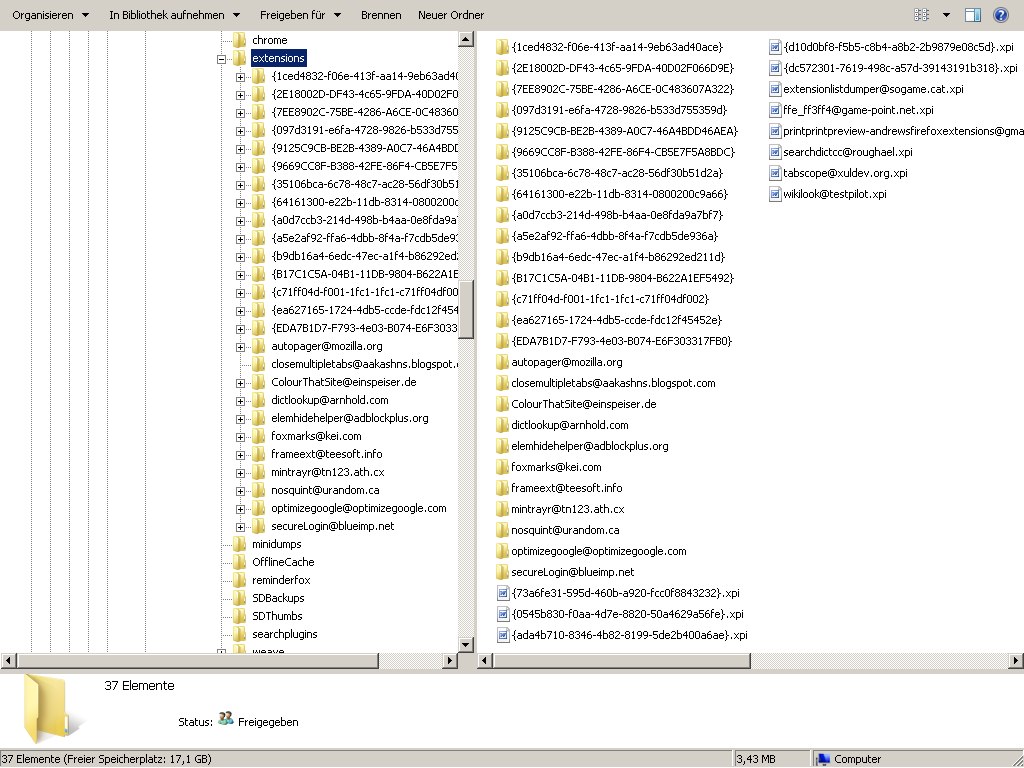 Dort wo Namen erkennbar sind, sehe ich nichts von McAfee (siehe Anlage). Die Ausdrücke in den geschweiften Klammern kann ich sowieso nicht zuordnen. Auch in den Listen von Firefox selbst (Plugins und Erweiterungen) ist nichts mehr von McAfee drin.