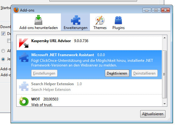 unter meinen Addons hatte ich Microsoft Net Framework Assistent aktiviert - ich habe es jetzt erst mal deaktiviert, habe unter anderem auch gelesen, dass in diesem Zusammenhang auch Probleme mit mit Fox auftreten könnten. Habe Gott sei Dank keine.