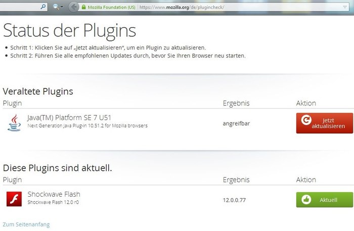 Habe aus about:addons heraus https://www.mozilla.org/de/plugincheck/ aufgerufen, Java SE 7 U51 10.51.2.13 sei angreifbar (rot markiert) - also aktualisiert. Hinterher ist das Ergebnis des Aktualitäts-Check aber wieder das gleiche. Siehe Screenshot. Darauf ist auch zu sehen das nur Java u. Shockwave Flash getestet werden, früher wurde z.B. auch Silverlight u. VLC getestet.