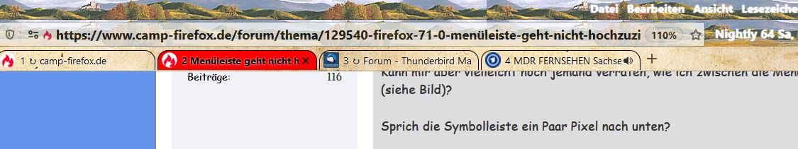 Ich sehe es nicht ganz so dramatisch, wie Du. Du hast im Grunde Recht. Mein FF ist immer aktuell, ich hatte nur die userChrome.css nicht aktualisiert. Und das Einzige was ich aus dem Ganzen nutze, ist nur das Eine, dass die Tabs unten bleiben. Mehr nutze ich daraus nicht....Ob das jetzt gleich ein Sicherheitsrisiko darstellt?! Nun gut! Das Einfachste wäre es, wenn es gleich im FF einstellbar wäre....Aber gut, die Anpassung an Chrome siegt da irgendwie. Schade, aber dann muss man zu diesen Mitteln greifen. Ich könnte mich jetzt mit deinem JS beschäftigen, aber ich fahr so eigentlich ganz gut, da es das Einzige eben ist, was ich anpasse. Aber wie schon erwähnt, DANKE für die Hinweise und Hilfe! Es regt immer wieder zum Nachdenken an, das ist Fakt!